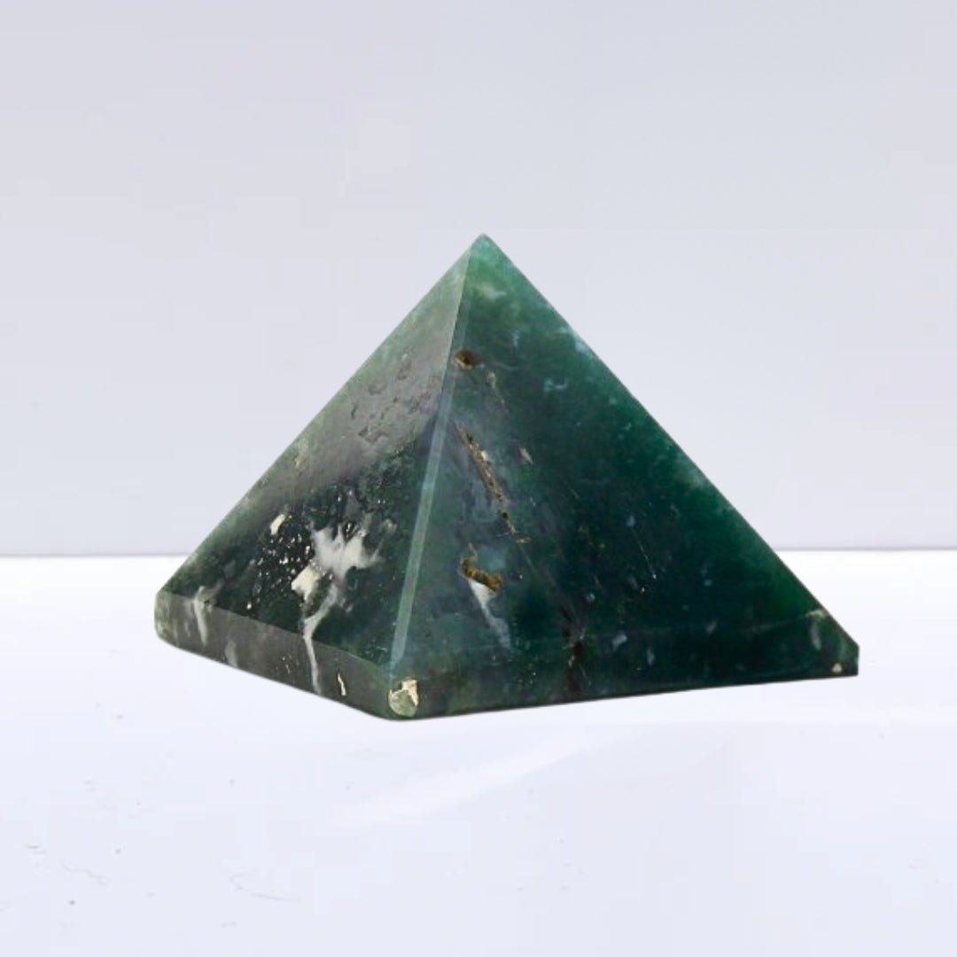 Al tratarse de minerales naturales cada pirámide es única en aspecto, color y dibujo, las piezas que se entregarán serán similares a las de las fotografías. El Ágata Musgo puede variar entre los colores verde, blanco, rojo y granate. El Ágata Musgo puede presentar pequeñas drusas y cristalizaciones debidas a su naturaleza.