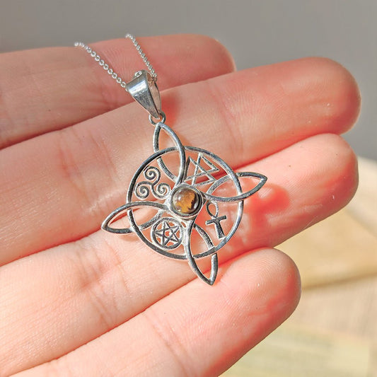 Colgante Nudo de Bruja con Ojo de Tigre y Símbolos Sagrados - Plata de Ley 925
