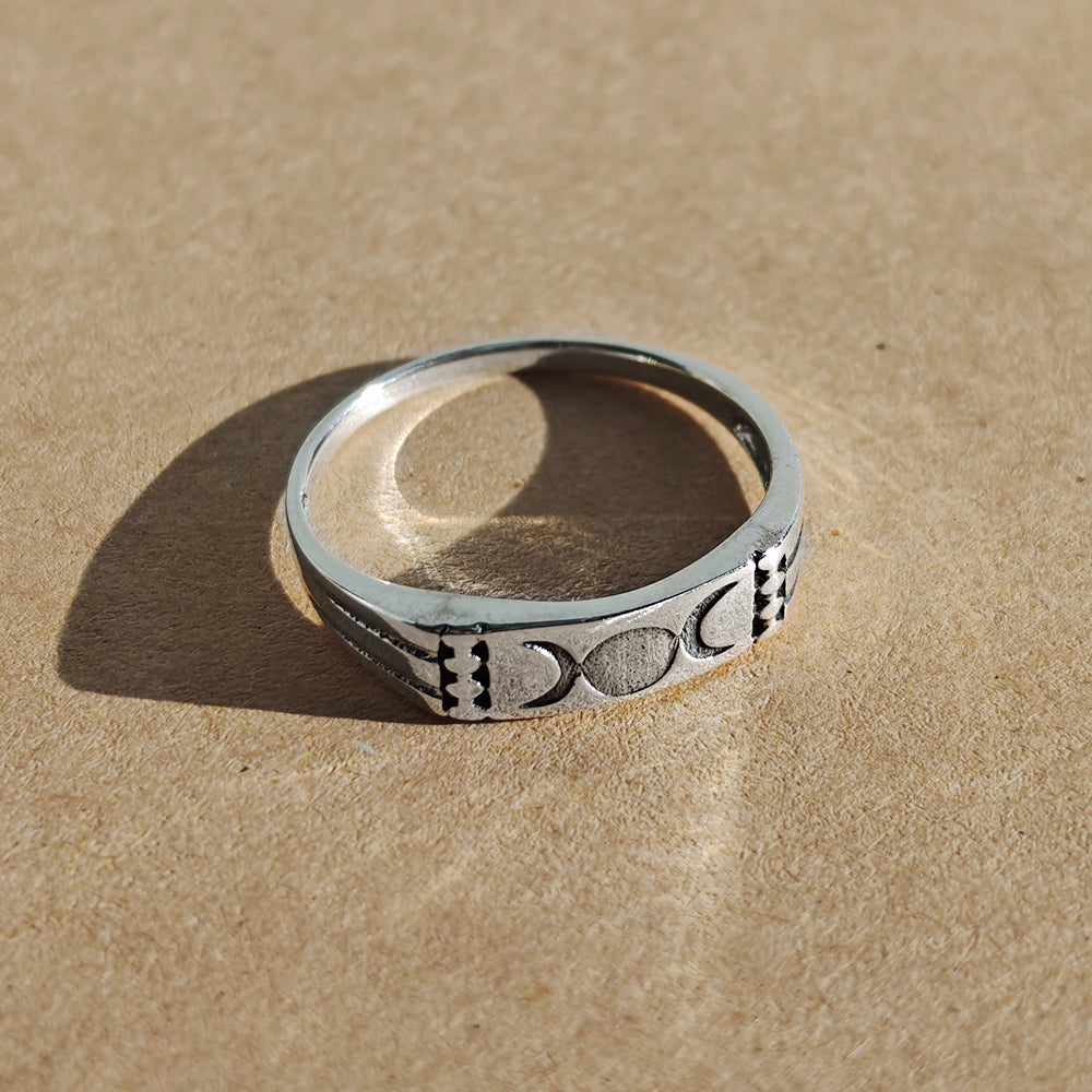 Este anillo representa las tres fases de la luna y los ciclos de la vida: la Doncella, la Madre y la Anciana. Un símbolo ancestral de transformación, intuición y conexión con lo divino femenino.